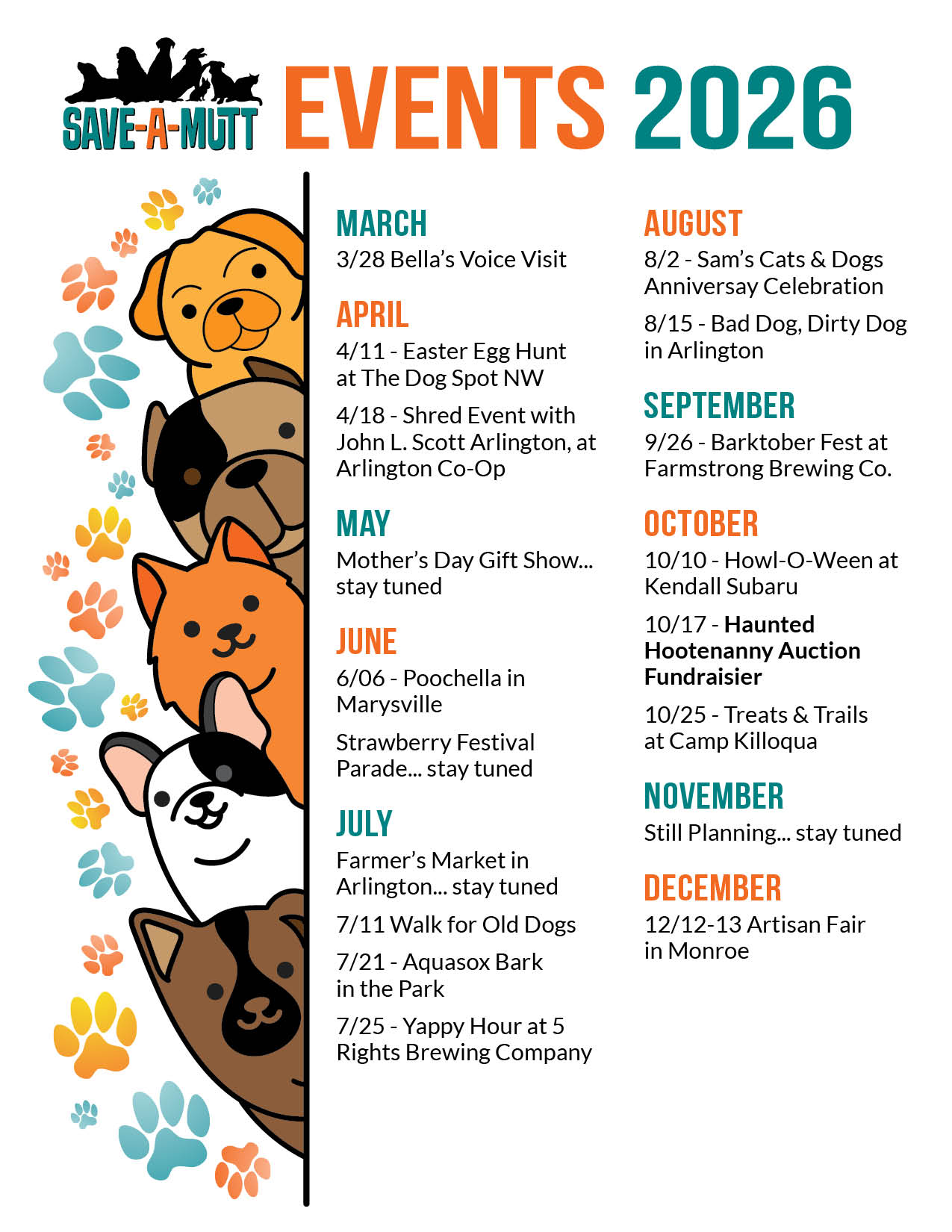 We are back! There are so many great events this year – most are family and dog friendly. We post all the details on our Facebook page.
